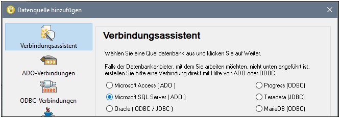 2.Wählen Sie Microsoft SQL Server (ADO) und klicken Sie auf Weiter. Daraufhin wird die Liste der verfügbaren ADO-Treiber angezeigt. In diesem Beispiel wird als Anbieter der SQL Server Native Client 11.0 verwendet. Sie können auch den Anbieter Microsoft OLE DB Provider for SQL Server auswählen.