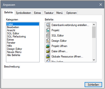 Auf dem Register Befehle können Sie Ihre Menüs oder Symbolleisten anpassen.