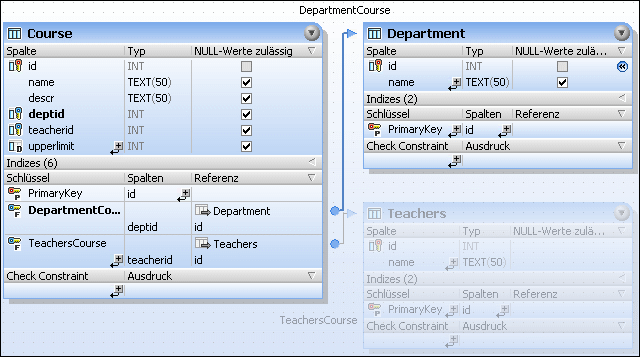 Wenn Sie zwei oder mehrere miteinander in Beziehung stehende Tabellen in den Design Editor ziehen, werden diese Beziehungen durch Linien illustriert, die die verwandten Tabellen verbinden. In DatabaseSpy werden verschiedene Farben zur Unterscheidung der verschiedenen Beziehungen verwendet: