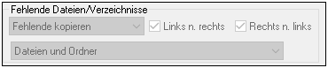 •Fehlende kopieren: Fehlende Dateien werden in das andere Verzeichnis kopiert. Mit Hilfe der Kontrollkästchen Links nach rechts und Rechts nach links können Sie nur ein bestimmtes Verzeichnis aktualisieren. Wenn Sie beide Kontrollkästchen aktivieren, werden fehlende Dateien in das jeweils andere Verzeichnis kopiert, so dass beide Verzeichnisse aktualisiert werden.