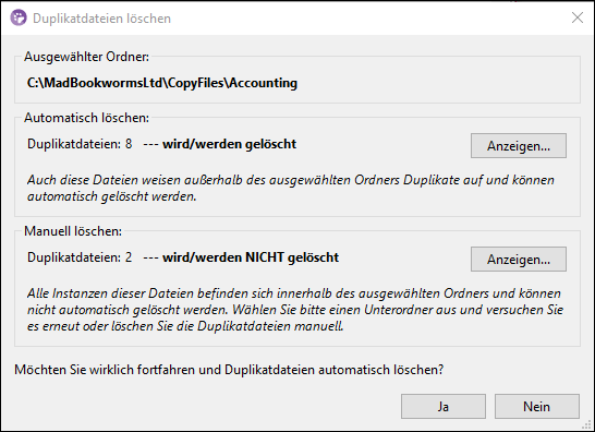 Im Dialogfeld Duplikatdateien löschen (Abbildung links unten) wird der Pfad zum ausgewählten Ordner und gegebenenfalls zu den Dateien, die automatisch und/oder manuell gelöscht werden können, angezeigt. Wenn eine Datei außerhalb des ausgewählten Ordners Duplikate hat, kann die Datei automatisch aus dem ausgewählten Ordner gelöscht werden (in unserem Beispiel ist der ausgewählte Ordner C:\MadBookwormsLtd\CopyFiles\Accounting) und die Duplikate der Datei aus anderen Ordnern werden beibehalten.