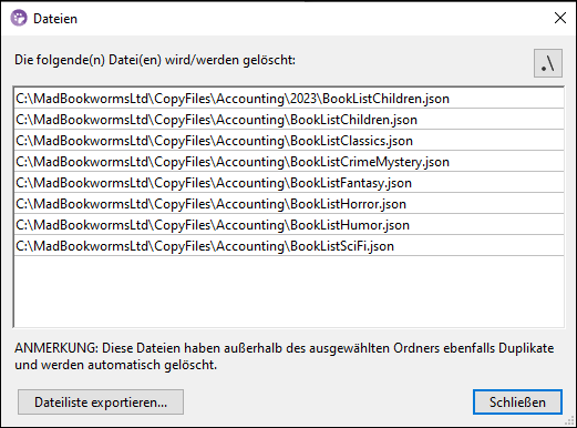 Wenn sich alle Duplikate der Datei im ausgewählten Verzeichnis befinden, werden Sie im Dialogfeld Duplikatdateien löschen auch über die Dateien informiert, die nur manuell gelöscht werden können Drücken Sie Anzeigen, um die Liste dieser Dateien zu sehen. Sie können die Liste auch kopieren oder durch Klick auf die Schaltfläche Dateiliste exportieren in einer Textdatei speichern.