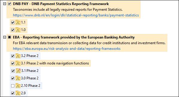 Installierte Taxonomien Diese werden auf der Benutzeroberfläche mit einem Häkchen angezeigt (in der Abbildung unten sind die mit einem Häkchen versehenen Versionen der DNB- und EBA-Taxonomie installiert). Wenn alle Versionen einer Taxonomie ausgewählt sind, wird ein Häkchen angezeigt. Wenn zumindest eine Version nicht ausgewählt ist, wird ein gefülltes Quadrat angezeigt. Sie können die Auswahl für eine installierte Taxonomie aufheben, um sie zu deinstallieren.