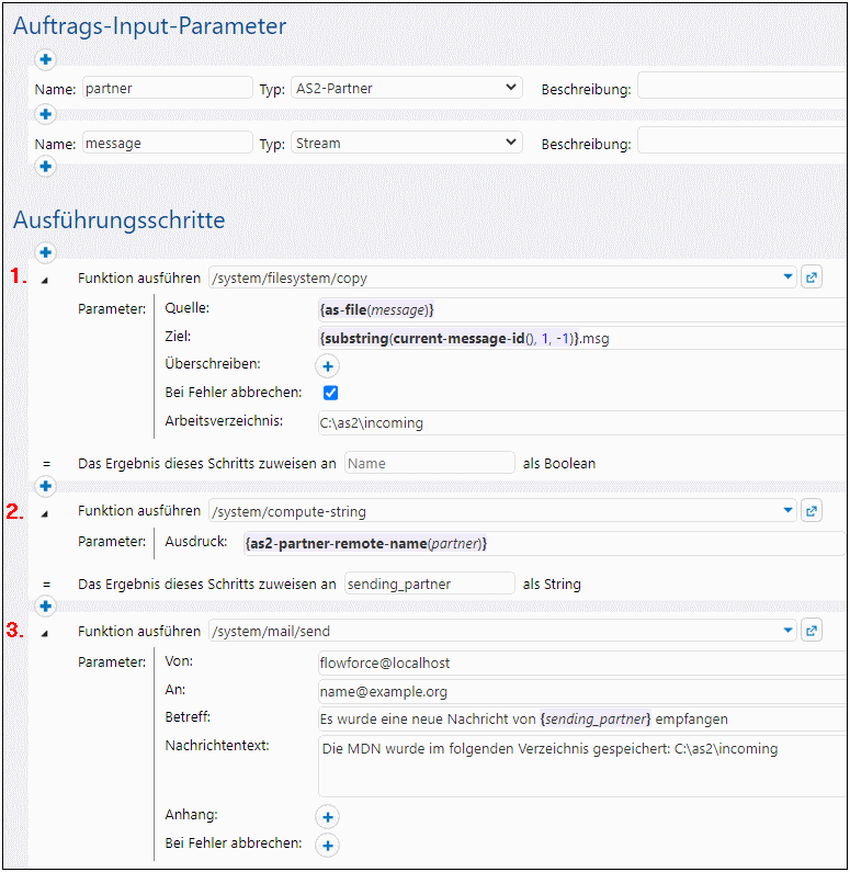 Wenn Sie einen Auftrag als AS2-Dienst konfigurieren, stehen die Informationen über den AS2-Partner und die von ihm gesendete Nachricht automatisch in den Auftrags-Input-Parametern partner und message (Abbildung unten) zur Verfügung. Im unten abgebildeten Auftrag sehen Sie, wie Sie den Namen eines AS2-Partners extrahieren und eine Benachrichtigung über eine neue AS2-Nachricht senden. Der Auftrag enthält drei Ausführungsschritte (siehe unten).