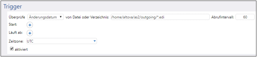 b) Klicken Sie auf Neuer Dateisystem-Trigger und definieren Sie die Trigger-Einstellungen wie unten gezeigt. Falls das Verzeichnis /home/altova/as2/outgoing auf dem Rechner "Hermes" nicht vorhanden ist, erstellen Sie es.