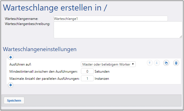 Mindestintervall zwischen den Ausführungen | Eine Ausführungs-Warteschlange hat Ausführungs-Slots, wobei die Anzahl der verfügbaren Slots von der Einstellung: "Maximale Anzahl der parallelen Ausführungen" multipliziert mit der gemäß der gerade aktiven Regel zugewiesenen Anzahl der Worker-Rechner abhängig ist. Mit jedem Slot werden Auftragsinstanzen der Reihe nach ausgeführt.