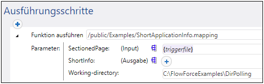 Mit dieser Konfiguration wird der Trigger jedes Mal, wenn ApplicationsPage.xml in das Arbeitsverzeichnis kopiert wird, ausgelöst. Da im Trigger auch ein Platzhalter (*.xml) verwendet wird, würde der Trigger auch ausgelöst, wenn eine beliebige andere XML-Datei, auch die Mapping-Ausgabe selbst (ShortInfo.xml), in das Verzeichnis kopiert wird. Da dies nicht erwünscht ist, fügen wir einen zweiten Schritt hinzu, in dem die generierte Ausgabedatei in ein neues Verzeichnis kopiert wird. Alternativ dazu könnten Sie den Trigger auch in C:\FlowForceExamples\DirPolling\ApplicationsPage.xml umbenennen (In diesem Fall ist kein zweiter Schritt erforderlich).
