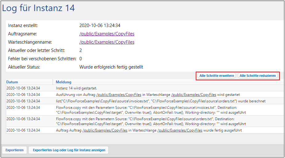 Auf der Seite "Log für Instanz N" (siehe Abbildung unten) finden Sie detaillierte Informationen über eine bestimmte Auftragsinstanz. Sie können diese Seite auf eine der folgenden Arten öffnen: