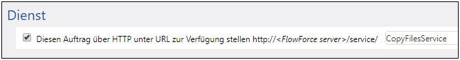 •Wenn Sie das optionale Feld Host-Name von FlowForce Server auf der Setup-Seite definieren, können Sie den Webservice-Aufruf direkt über die Auftragskonfigurationsseite ausführen, indem Sie neben dem Kontrollkästchen Diesen Auftrag über HTTP...zur Verfügung stellen auf die Schaltfläche