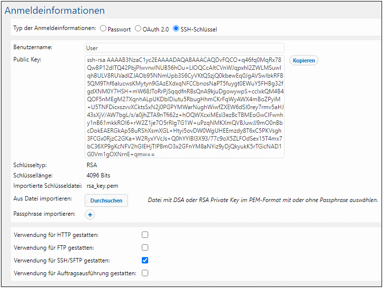 In der Abbildung unten sehen Sie SSH-Schlüssel-Anmeldeinformationen. Es wurde ein RSA-Schlüssel im PEM-Format importiert. Im Abschnitt Anmeldeinformationen werden Informationen über die importierte Datei angezeigt. Der Public Key kann kopiert und an den Administrator des Remote Servers oder das System gesendet werden. Stellen Sie beim Erstellen eines SSH-Schlüssels sicher, dass das Kontrollkästchen Verwendung für SSH/SFTP gestatten aktiviert ist (Abbildung unten).