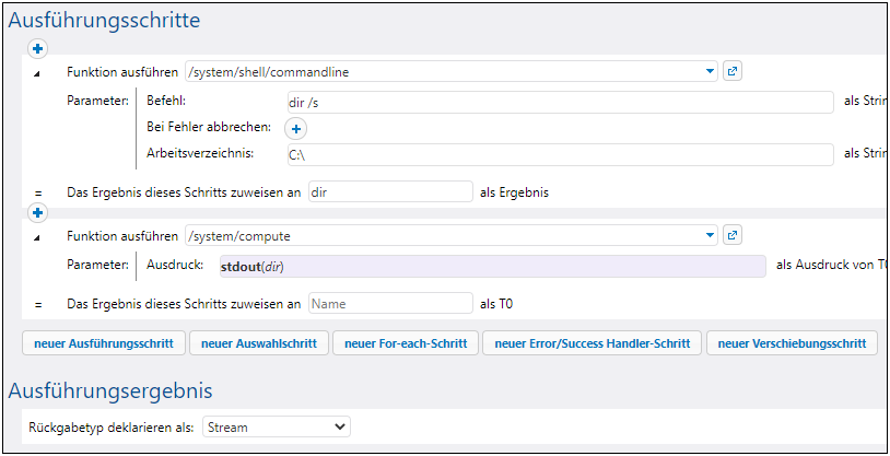 6.Setzen Sie den Rückgabetyp unter "Ausführungsergebnis" auf Stream. Wie Sie vielleicht bemerkt haben, haben wir denselben Datentyp wie den gewählt, der vom letzten Ausführungsschritt des Auftrags zurückgegebenen wurde. Die Auftrag sollte nun folgendermaßen aussehen: