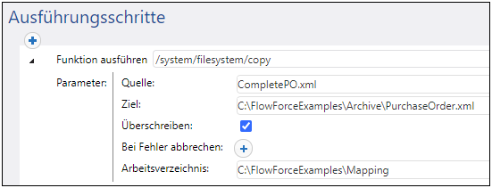 Es muss sich hierbei um eine vorhandene Datei oder ein vorhandenes Verzeichnis in dem Betriebssystem, in dem FlowForce Server ausgeführt wird, handeln. Wir möchten die Datei in diesem Beispiel beim Kopieren umbenennen, daher fügen wir den Dateinamen zum Pfad folgendermaßen hinzu: