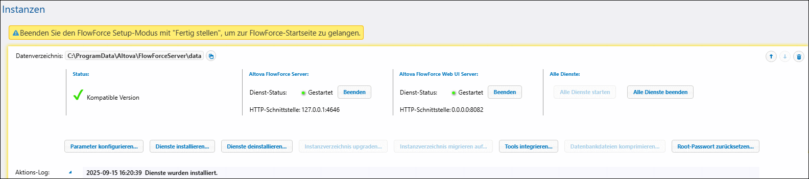 Informationen zum Erstellen, Konfigurieren und Installieren einer Server-Instanz finden Sie weiter unten unter Konfiguration. Beachten Sie, dass Sie vor Komprimierung der Datenbankdateien, dem Upgrade der Datenbank, der Integration von Tools und der Migration Ihrer Instanzdaten den FlowForce Server und FlowForce Web Server-Dienst beenden müssen.