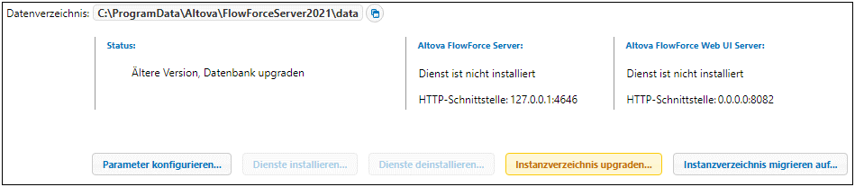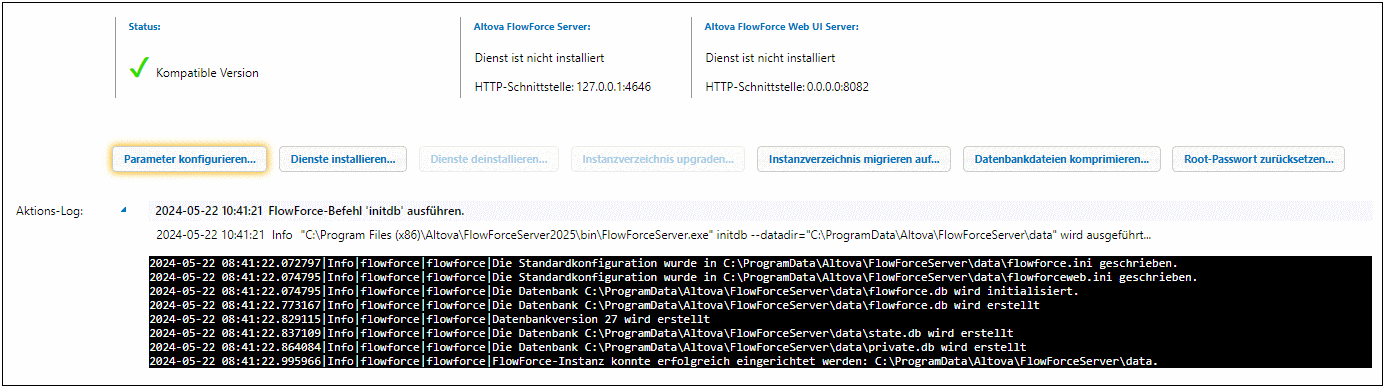Sobald Sie die Instanz initialisiert haben, werden der aktuelle Status, protokollierte Aktivitäten sowie verschiedene Konfigurationsoptionen angezeigt (Abbildung unten). Im Status sehen Sie, ob die Server-Version kompatibel ist. Außerdem wird angezeigt, ob der FlowForce Server- und der FlowForce Web Server-Dienst installiert sind und ausgeführt werden.