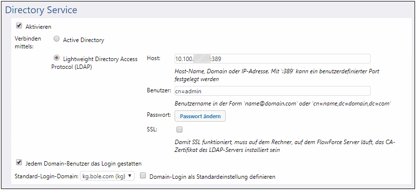 Aktivieren Sie dieses Kontrollkästchen, damit sich Benutzer mit ihrem Domain-Benutzernamen und Passwort beim FlowForce Server anmelden können. Wenn dieses Kontrollkästchen aktiviert ist, müssen Sie eine der beiden unten beschriebenen Optionen Active Directory oder Lightweight Directory Access Protocol (LDAP) aktivieren.