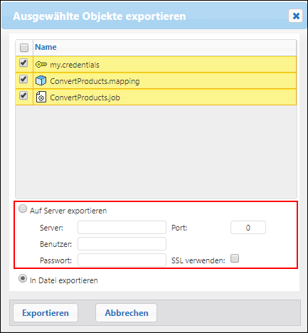 3.Im Dialogfeld Ausgewählte Objekte exportieren (Abbildung unten) können Sie auswählen, ob Ihre Konfigurationsdaten in eine laufende FlowForce Server-Instanz (Auf Server exportieren) oder in eine Datei mit der Erweiterung .zip exportiert werden sollen. Wenn Sie zur Option Auf Server exportieren wechseln (unten rot umrandet), müssen Sie den Host-Namen des FlowForce-Zielservers, den Port, an dem er ausgeführt wird, Ihren Benutzernamen und das Passwort in der FlowForce-Zielinstanz eingeben und anschließend auf Exportieren klicken.