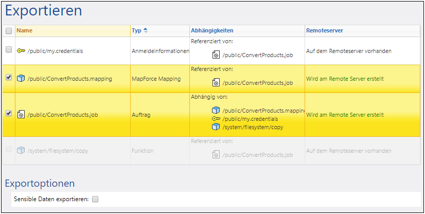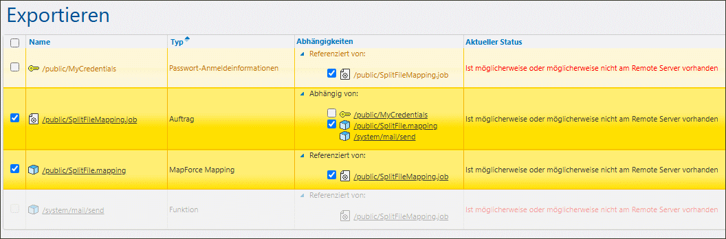Die Spalte Remoteserver zeigt an, ob die Datei am Zielserver vorhanden ist. Falls die abhängigen Dateien am Zielserver bereits vorhanden sind, können Sie diese Datensätze getrost vom Export ausnehmen. Andernfalls würden solche Aufträge, deren Abhängigkeiten nicht exportiert wurden und die dann am Zielserver fehlen, höchstwahrscheinlich fehlschlagen.