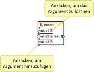 Einige vordefinierte MapForce-Funktionen können erweitert werden, d.h. Sie können so viele Parameter, wie Sie für Ihre Mapping-Zwecke benötigen, hinzufügen. Ein gutes Beispiel dafür ist die Funktion concat. Um (bei Funktionen, die dies unterstützen) Funktionsargumente hinzuzufügen oder zu löschen, klicken Sie neben dem entsprechenden Parameter auf Parameter hinzufügen ( gui_add_function_parameter ) bzw. Parameter löschen ( gui_delete_function_parameter ) (siehe unten). Wenn Sie eine Verbindung auf das Symbol gui_add_function_parameter ziehen, wird ein weiterer Parameter hinzugefügt und verbunden.