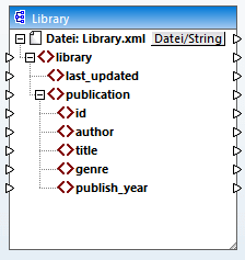 In nächsten Schritt wird nun eine Zielkomponente namens Library.xsd hinzugefügt. Um die Zieldatei hinzuzufügen, klicken Sie auf ic-new-schema (XML-Schema/Datei einfügen). Klicken Sie auf Überspringen, wenn Sie von MapForce aufgefordert werden, eine Instanzdatei bereitzustellen. Klicken Sie anschließend auf die Überschrift der neuen Komponente und ziehen Sie sie auf die rechte Seite der beiden Quellkomponenten. Sie können Sie Mapping-Komponenten jederzeit beliebig verschieben. Wenn Sie eine Quellkomponente jedoch links von der Zielkomponente platzieren, wird das Mapping übersichtlicher und verständlicher. Dies ist auch die Konvention bei allen in dieser Dokumentation gezeigten Mappings und bei allen mit MapForce installierten Beispielmappingdateien.