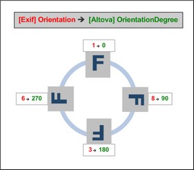 OrientationDegree übersetzt den Standard-Exif-Tag Orientation von einem Ganzzahlwert (1, 8, 3 oder 6) in die entsprechenden Gradwerte dafür (0, 90, 180, 270) (siehe Abbildung unten). Beachten Sie dass es keine Übersetzung der Orientation-Werte 2, 4, 5, 7 gibt. (Diese Ausrichtungen werden durch Spiegelung des Bilds 1 an seiner senkrechten Mittelachse zur Erzeugung des Bilds mit dem Wert 2 und anschließende Drehung dieses Bilds um jeweils 90 Grad zur Erzeugung der Werte 7 bzw. 4 bzw. 5 erzielt).