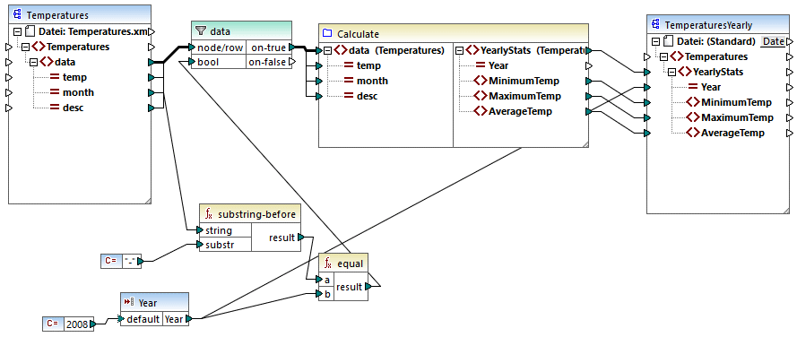 Wie gewöhnlich beginnt die Mapping-Ausführung beim obersten Datenelement der Zielkomponente (in diesem Beispiel YearlyStats). Um diesen Node zu befüllen, versucht das Mapping die Quelldaten aus der UDF zu holen, welche wiederum den Filter auslöst. Die Rolle des Filters ist es, nur Temperaturen aus dem Jahr 2008 an die UDF zu übergeben.