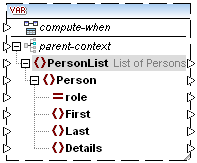 Die Variable verhält sich so, als wäre sie ein Child-Element des mit compute-when verbundenen Datenelements. Auf diese Art kann die Variable an ein bestimmtes Quelldatenelement gebunden werden, d.h. die Variable wird zur Laufzeit immer dann neu ausgewertet, wenn ein neues Datenelement aus der Sequenz in der Quellkomponente gelesen wird. Dies steht im Zusammenhang mit der allgemeinen Regel zu Verbindungen in MapForce: Erstelle für jedes Quelldatenelement ein Zieldatenelement. In diesem Fall berechnet MapForce aufgrund von compute-when den Variablenwert für jedes Quelldatenelement. Nähere Informationen dazu finden Sie unter Mapping-Regeln und Strategien.