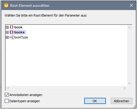 4.Definieren Sie das Root-Datenelement für die Struktur der Variablen, wenn Sie danach gefragt werden. So können Sie z.B. in XML-Schemas jedes beliebige Element oder jeden beliebigen Typ aus der ausgewählten Quelldatei auswählen (siehe Abbildung unten).
