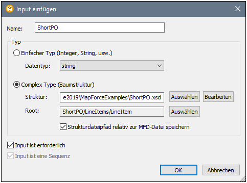 Falls das Kontrollkästchen Strukturdateipfad relativ zur MFD-Datei speichern aktiviert ist, wird der absolute Pfad der Strukturdatei beim Speichern des Mappings in einen Pfad umgewandelt, der relativ zum aktuellen Mapping ist. Nähere Informationen dazu finden Sie unter Relative und absolute Pfade. Eine Erläuterung zu den Kontrollkästchen Input ist erforderlich und Input ist eine Sequenz finden Sie weiter unten.