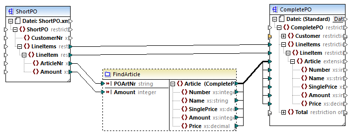 Wenn Sie eine benutzerdefinierte Funktion erstellen, müssen Sie angeben, welche Input-Parameter (falls überhaupt) diese erhalten soll und welchen Output die Funktion erzeugen soll. Während Input-Parameter manchmal nicht benötigt werden, ist ein Output-Parameter in jedem Fall erforderlich.. Funktionsparameter können einen simpleType (wie z.B. String oder Ganzzahl) oder eine komplexe Struktur haben. So hat etwa die unten gezeigte benutzerdefinierte Funktion FindArticle zwei Input- und einen Output-Parameter: