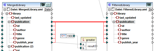 Nachdem die publication-Funktion gelöscht wurde, wird die "Alles kopieren"-Verbindung direkt zwischen dem Node publication in MergedLibrary und dem Node publication in FilteredLibrary erstellt (siehe Abbildung unten).