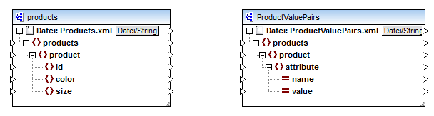In diesem Beispiel wird gezeigt, wie Sie Elementnamen aus einem XML-Dokument auf Attributwerte in einem XML-Zieldokument mappen. Das Mapping zu diesem Beispiel finden Sie im folgenden Ordner: <Dokumente>\Altova\MapForce2025\MapForceExamples\ConvertProducts.mfd.