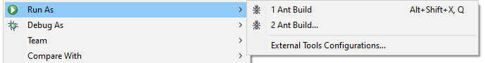 1.Klicken Sie in der Package Explorer-Ansicht von Eclipse mit der rechten Maustaste auf die Datei build.xml und verweisen Sie auf das Menü Run as. Im "Run As"-Menü werden zwei Optionen für die Ausführung der Ant Build-Datei angezeigt. Wenn Sie die erste Option auswählen, startet Eclipse den Ant Build mit den Standardeinstellungen. Bei Auswahl der zweiten Option können Sie die Einstellungen des Ant Build vor dem Start ändern. Wählen Sie die zweite Option aus.