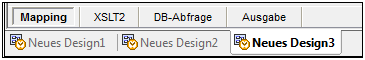 In MapForce wird ein Multiple Document Interface (MDI) verwendet. Jede in MapForce geöffnete Mapping-Datei hat ein eigenes Fenster. Auf diese Art können Sie mit mehreren Mapping-Fenstern arbeiten und diese auf verschiedene Arten im Hauptfenster von MapForce anordnen und in der Größe anpassen. Sie können alle offenen Fenster auch nach den Windows-Standard-Layouts "Horizontal anordnen", "Vertikal anordnen" und "Überlappend" anordnen. Wenn mehrere Mappings in MapForce geöffnet sind, können Sie über die im unteren Bereich des Mapping-Fensters angezeigten Register jederzeit zwischen den Mappings wechseln (siehe Abbildung unten).