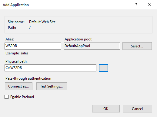 3.Geben Sie unter "Physischer Pfad" den Pfad, unter dem die Applikation zuvor veröffentlicht wurde, ein (in diesem Beispiel "C:\WS2DB").