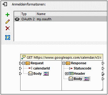 In diesem Beispiel wird gezeigt, wie Sie einen REST-Webservice, für den eine OAuth 2.0-Autorisierung erforderlich ist, aufrufen. Die Client-Applikation ist ein MapForce Mapping. Darin werden über die Google Calendar API (https://developers.google.com/calendar/) Kalenderereignisse abgerufen. Aus Gründen der Einfachheit ruft das Mapping die Kalenderinformationen im Istzustand ab und gibt nur das rohe JSON-Result aus, ohne dieses weiter zu verarbeiten.