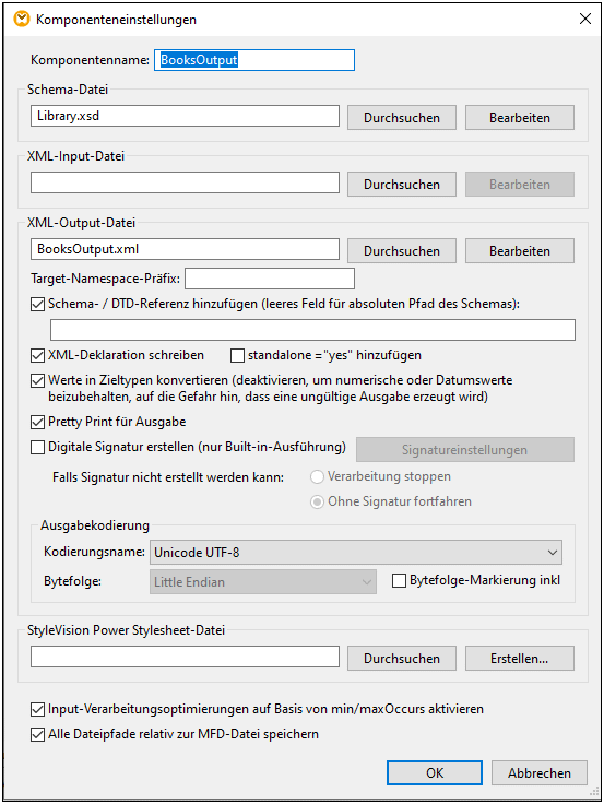 Gestattet Ihnen, eine digitale Signatur zur XML-Ausgabeinstanzdatei hinzuzufügen. Digitale Signaturen können nur generiert werden, wenn als Transformationssprache Built-In gewählt wurde (siehe auch Digitale Signaturen).