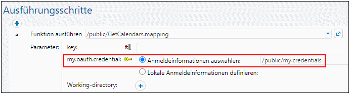Ein FlowForce-Auftrag, der das Mapping ausführt, muss die entsprechenden OAuth 2.0-Anmeldeinformationen, die Sie bereitgestellt oder zuvor in FlowForce Server erstellt haben, referenzieren (Abbildung oben). Auf diese Art wird das OAuth 2.0-Anmeldeinformationen-Objekt mit dem Mapping-Schritt verknüpft.