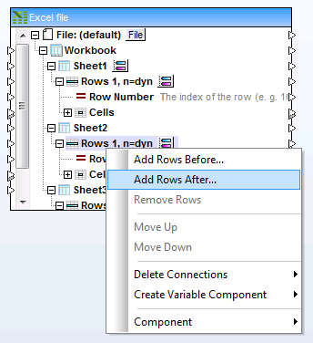 Sie können im selben Arbeitsblatt so viele Zeilenbereiche wie notwendig erstellen und die nicht benötigten Bereiche entfernen. Um einen neuen Zeilenbereich hinzuzufügen, klicken Sie mit der rechten Maustaste auf einen beliebigen Zeilen-Node ( disp_excel_row ) und wählen Sie den Befehl Zeilen davor hinzufügen bzw. Zeilen danach hinzufügen.