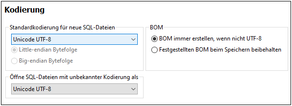 Im Abschnitt Kodierung können Sie Kodierungsoptionen für mit dem SQL Editor erstellte oder geöffnete SQL-Dateien definieren (siehe Abbildung unten).
