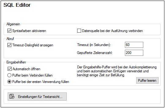 •Eingabehilfen. Um die Autokomplettierungsvorschläge bei Beginn der Eingabe von SQL-Anweisungen zu aktivieren, aktivieren Sie das Kontrollkästchen Automatisch öffnen (siehe auch SQL-Autokomplettierungsvorschläge). Sie können auswählen, wann der Eingabehilfe-Puffer befüllt werden soll: Wenn Sie eine Verbindung zu einer Datenquelle herstellen oder bei der ersten Verwendung des Puffers. Beachten Sie, dass dieser Vorgang einige Zeit dauern kann. Über die Schaltfläche Puffer leeren können Sie den Puffer zurücksetzen.