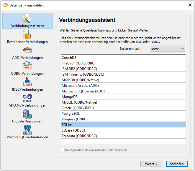 Die Datenbanken können im Verbindungsassistent-Fenster (siehe Abbildung unten) alphabetisch nach dem Namen des Datenbanktyps oder dem zuletzt verwendeten Datenbanktyp sortiert werden. Wählen Sie die gewünschte Option in der Auswahlliste Sortieren nach aus. Klicken Sie nach Auswahl des gewünschten Datenbanktyps auf Weiter.