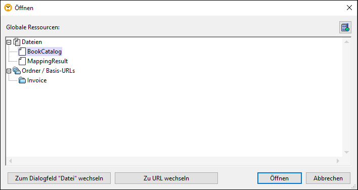 Um globale Ressourcen hinzuzufügen, zu bearbeiten oder zu löschen, klicken Sie auf die Schaltfläche Globale Ressourcen verwalten (oben rot umrandet). Im Dialogfeld Öffnen für globale Ressourcen können Sie zurück zum Dialogfeld zum Öffnen von lokalen Dateien wechseln (Zum Dialogfeld "Datei" wechseln) oder eine Datei über eine URL öffnen (Zu URL wechseln).