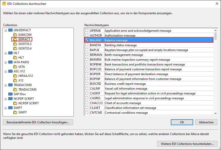 3.Aktivieren Sie das Kontrollkästchen neben dem gewünschten Nachrichtentyp und klicken Sie auf OK. Eine einzelne EDI-Komponente kann mehrere Nachrichtentypen desselben Standards und derselben Release enthalten. Wir haben in unserem Beispiel die BALANC-Nachricht ausgewählt (rotes Rechteck oben).