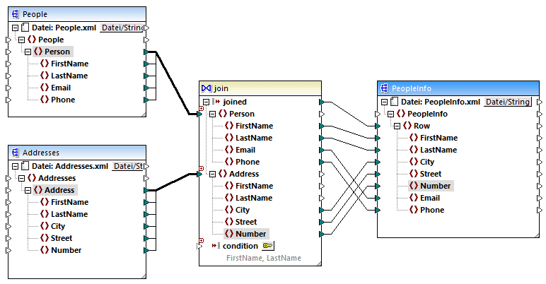 In diesem Beispiel wird gezeigt, wie Sie Daten aus zwei XML-Strukturen auf Basis von Bedingungen mittels einer Join-Komponente miteinander verknüpfen. Das Mapping-Beispiel dazu finden Sie unter dem folgenden Pfad: <Dokumente>\Altova\MapForce2024\MapForceExamples\JoinPeopleInfo.mfd.