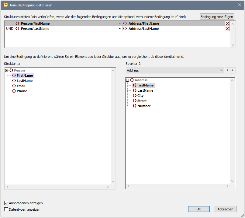 Wenn mehrere Bedingungen definiert werden, müssen alle davon "true" ergeben, damit die Join-Verknüpfung erstellt wird. In diesem Beispiel wird die Join-Verknüpfung daher nur erstellt, wenn beide Vergleiche "true" ergeben. Wenn nur eine der obigen Bedingungen definiert würde, würden auch Personen-Datensätze verknüpft, die denselben Vornamen (FirstName) aber einen anderen Nachnamen (LastName) haben.