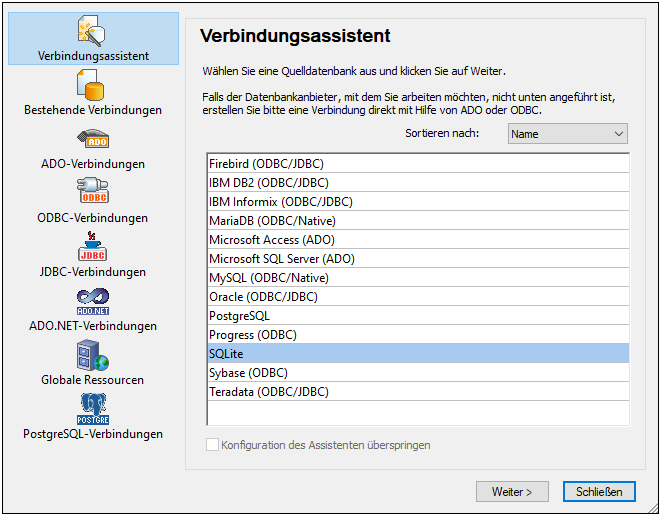 Die Datenbanken können im Verbindungsassistent-Fenster (siehe Abbildung unten) alphabetisch nach dem Namen des Datenbanktyps oder dem zuletzt verwendeten Datenbanktyp sortiert werden. Wählen Sie die gewünschte Option in der Auswahlliste Sortieren nach aus. Klicken Sie nach Auswahl des gewünschten Datenbanktyps auf Weiter.