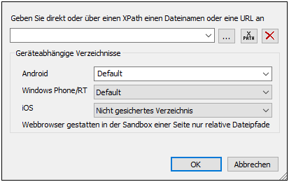 •Audiodatei: Klicken Sie auf die Schaltfläche Zusätzliches Dialogfeld, um die abzuspielende Audiodatei zu definieren. Dabei kann es sich um eine URL oder einen relativen Dateipfad handeln und es kann sich entweder um einen statischen Wert handeln oder der Pfad kann mittels eines XPath-Ausdrucks definiert oder generiert werden. Mit Hilfe relativer Dateipfade können auf dem Mobilgerät gespeicherte Dateien definiert werden. Sie werden relativ zu dem für diesen Gerätetyp definierten Basisverzeichnis aufgelöst (siehe Abbildung unten). Informationen zu Audiodateiformaten finden Sie unter Audio/Video-Formate.