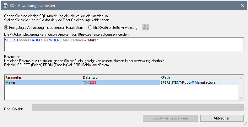 Um einen Parameter zu verwenden, setzen Sie in der gewünschten SQL-Anweisung einen Doppelpunkt (:) vor den Parameternamen. Sobald Sie den ersten Buchstaben nach dem Doppelpunkt eingeben, wird im Bereich "Parameter" ein Eintrag für den Parameter erstellt. Geben Sie als nächstes im Bereich "Parameter" einen XPath-Ausdruck ein, der den Wert des Parameters liefert. Sie können beliebig viele Parameter eingeben.