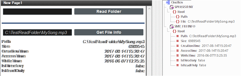 •Für das BeiSchaltflächenklick-Ereignis der Schaltfläche Get File Info wurde eine Dateiinfo abrufen-Aktion für die in $PERSISTENT/Root/File gespeicherte Datei (bzw. Ordner) definiert.