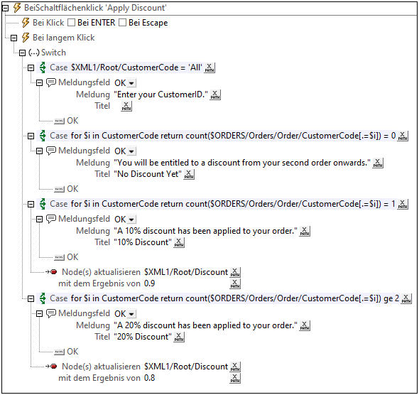Für jede Case-Aktion ist eine Gruppe entsprechender Aktionen definiert. So wird z.B. in unserer hypothetischen Lösung in der ersten Case-Aktion die Situation behandelt, in der noch kein Kundencode eingegeben wurde. In der zweiten Case-Aktion werden die Aktionen definiert, die ausgeführt werden sollen, wenn für den aktuellen Kunden in der Datenbank noch keine vorherigen Bestellungen vorhanden sind (in diesem Fall wird kein Rabatt angewendet). In der dritten und vierten Case-Aktion werden die Aktionen definiert, die ausgeführt werden sollen, wenn für den aktuellen Kunden in der Datenbank eine vorherige Bestellung bzw. zwei oder mehr vorherige Bestellungen gespeichert sind; in jedem dieser Fälle wird ein anderer Rabatt angewendet (10% bzw. 20%).